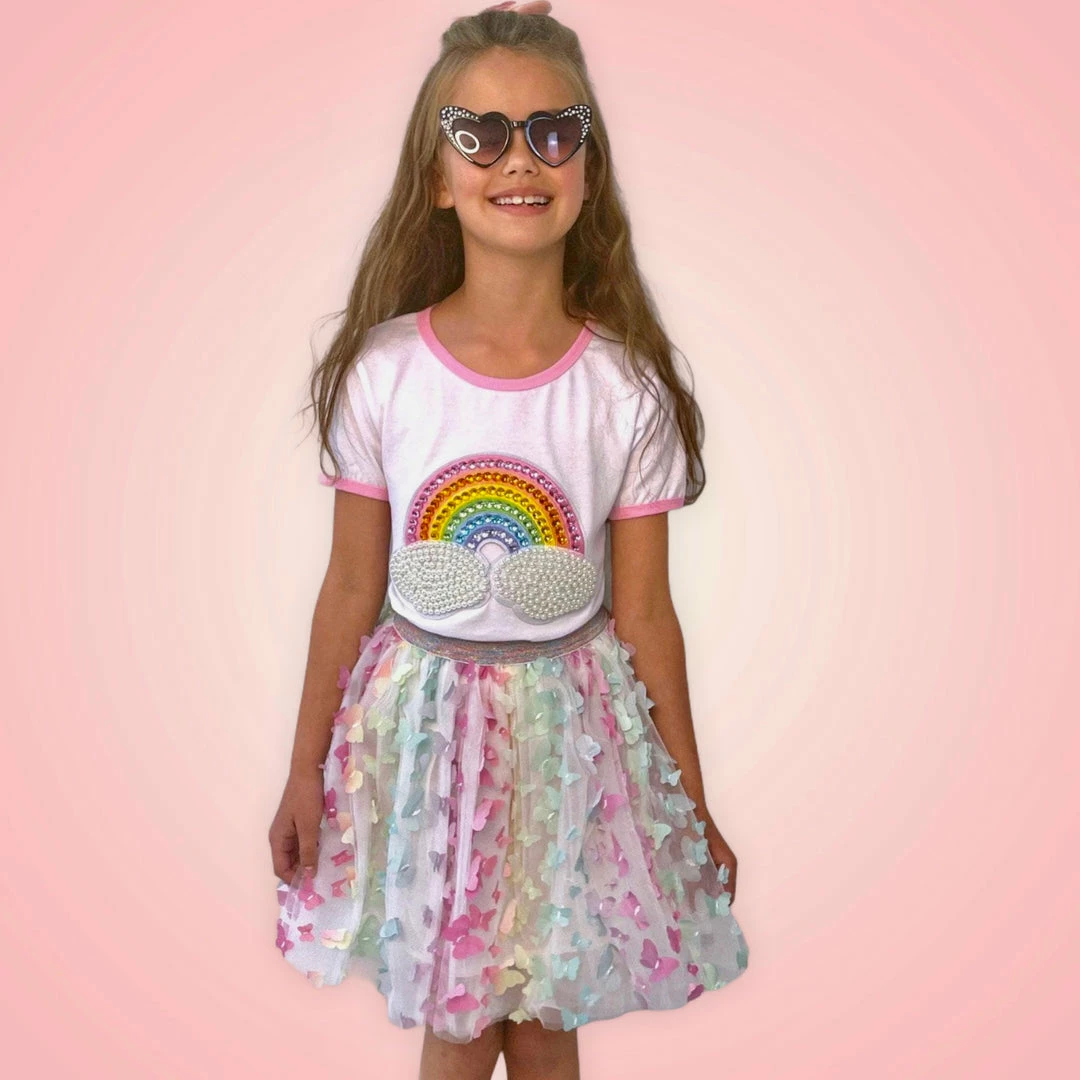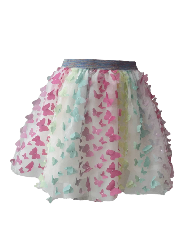 A show-stopping accessory, this white tutu with silver waistband covered in neon 3D butterflies is a true eye-catcher!