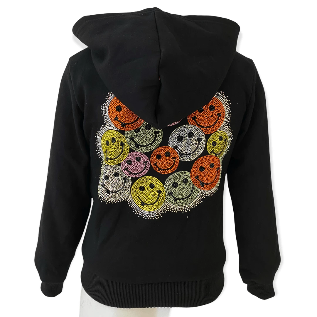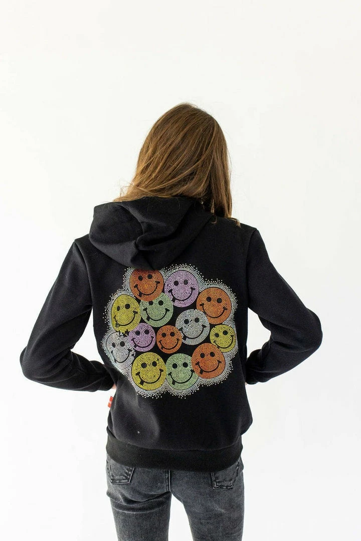 This black zip-up hoodie is perfect for a fun day out! The rainbow crystals on the back will add some sparkle and shine to your outfit.
