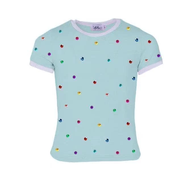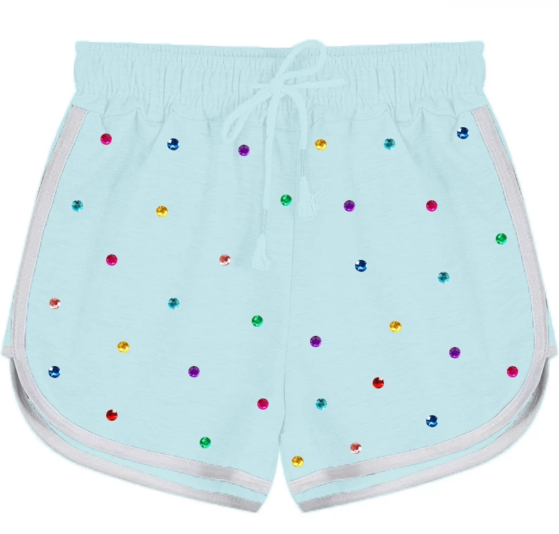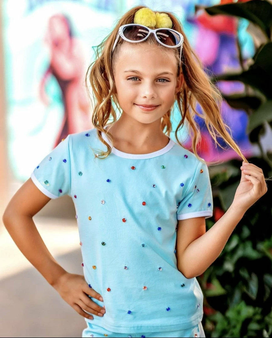 Baby blue short sleeve and shorts set with assorted rainbow gems all over! Sure to shine all summer long in this set!
