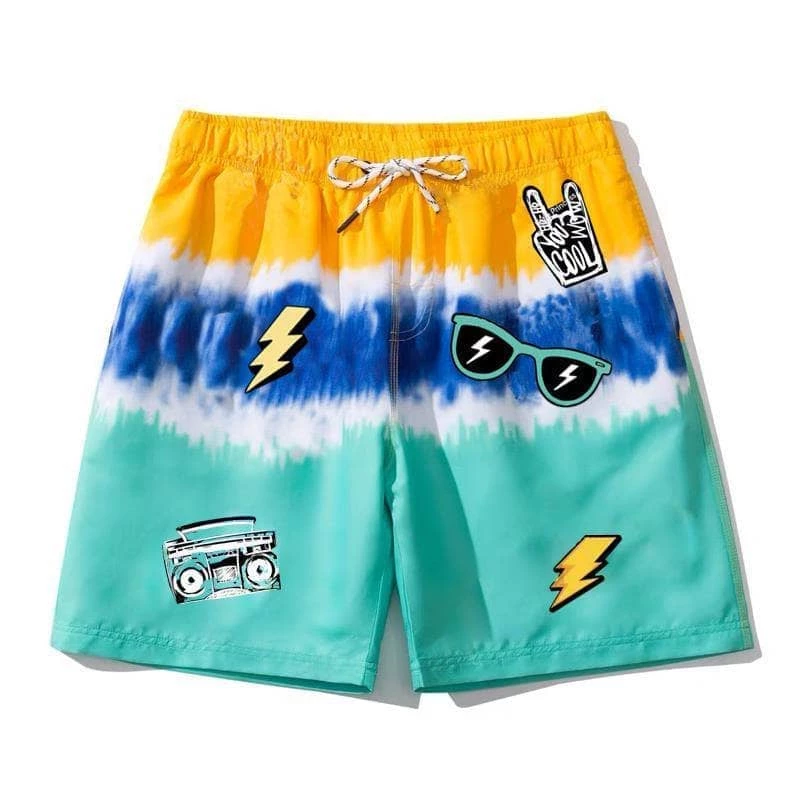 Royal blue, turquoise, and yellow tie dye swim trunks with summer themed patches!Â