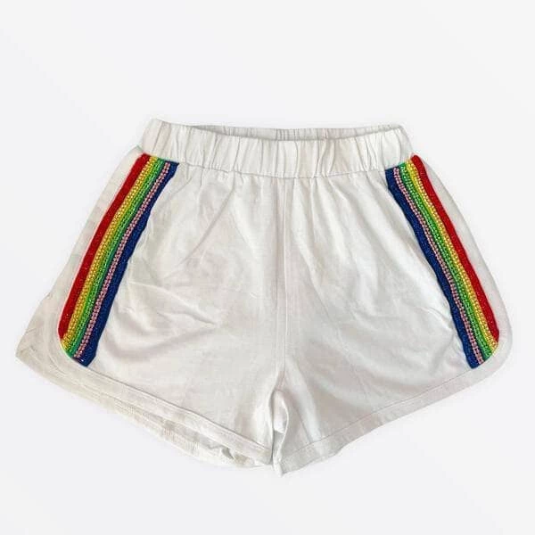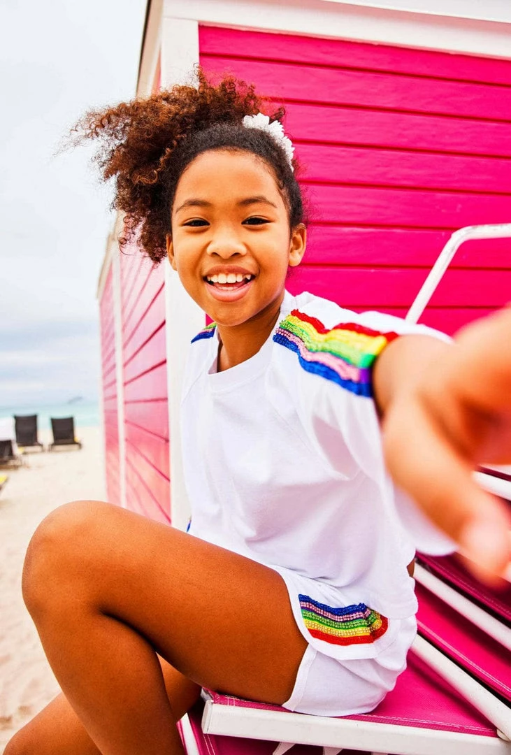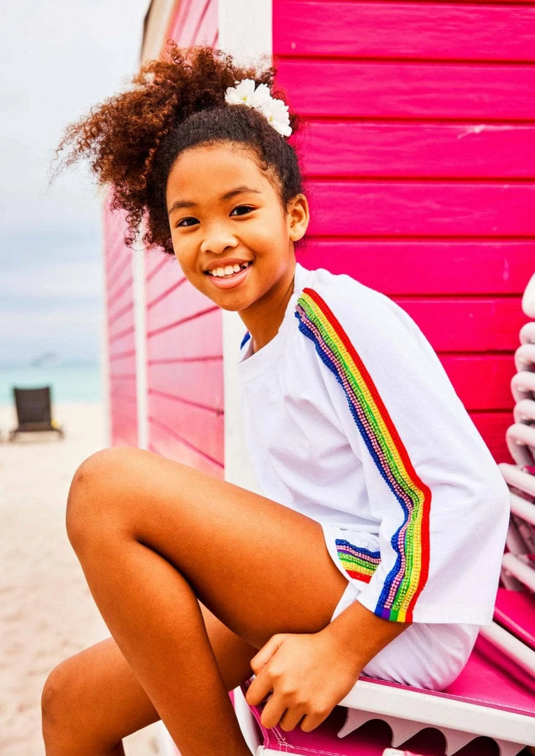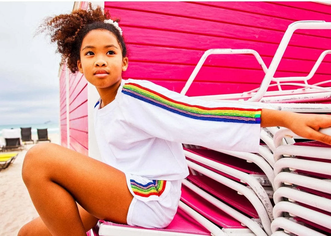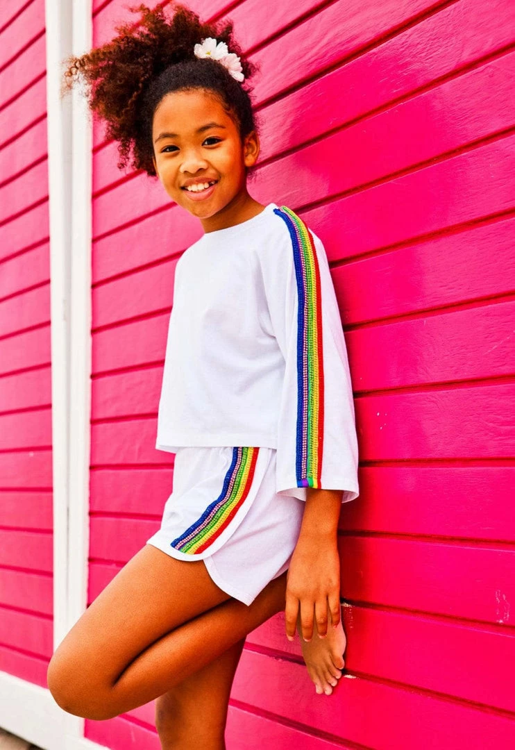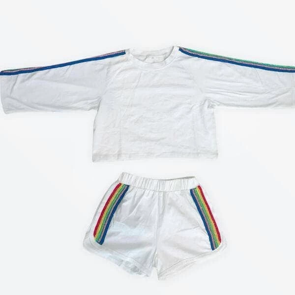 If you are looking for a sporty outfit, here’s the perfect one for you! A matching sporty set in white with beautiful crystal rainbow details make this sporty and fun