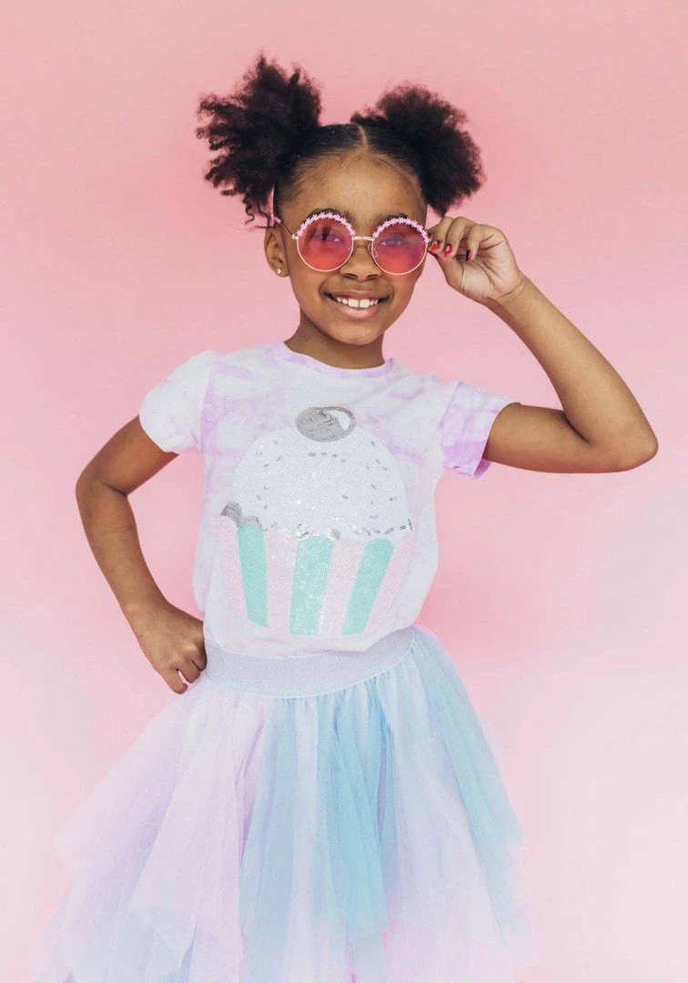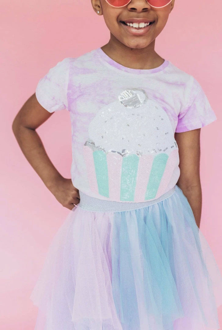 The perfect summer lavender tie dye short sleeve tee with sequin pink cupcake!