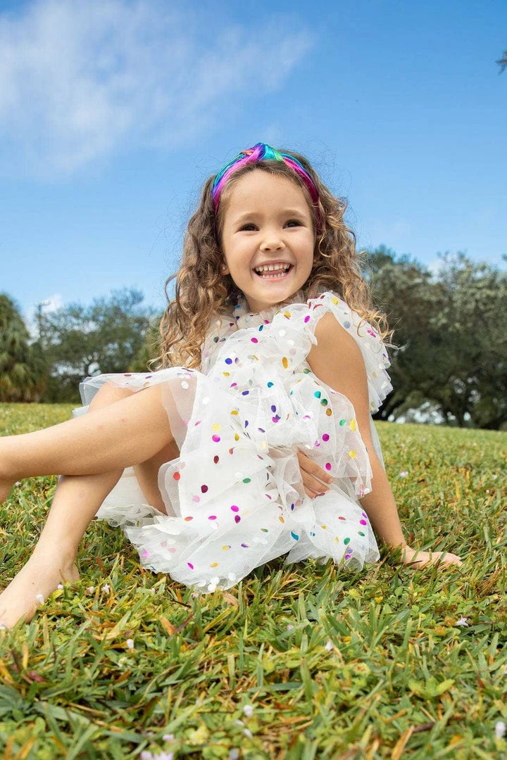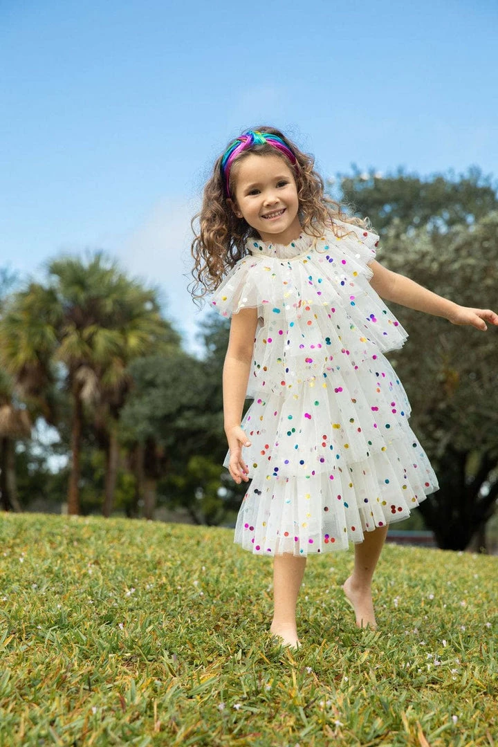 Feel a classy look with this beautiful tulle dress with colorful dots designed around it, making it even more dazzling.