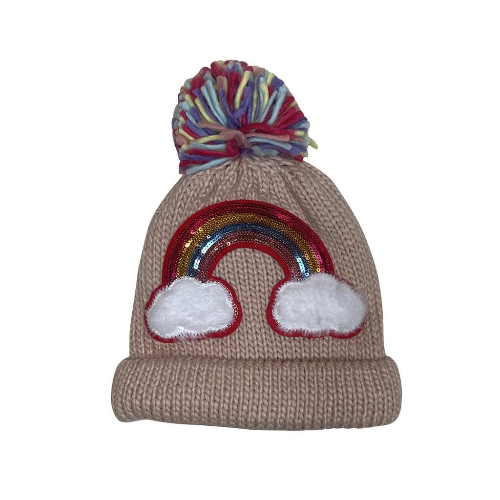 Beanies with a fuzzy rainbow cloud patch and a rainbow fringe pom!