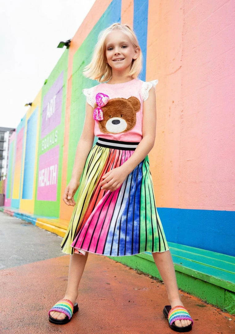 Pink heathered tank with lace sleeve details and fuzzy teddy bear patch with pink bow!