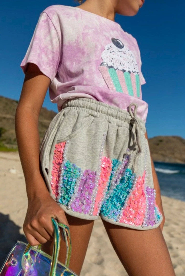 The most comfortable cotton grey track shorts with beaded pink and blue embellishments!