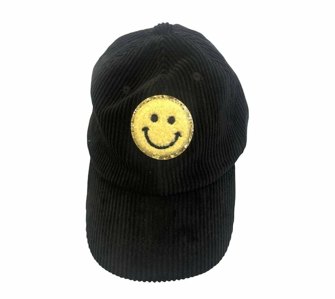 the cutest black baseball cap with the perfect yellow smiley face!