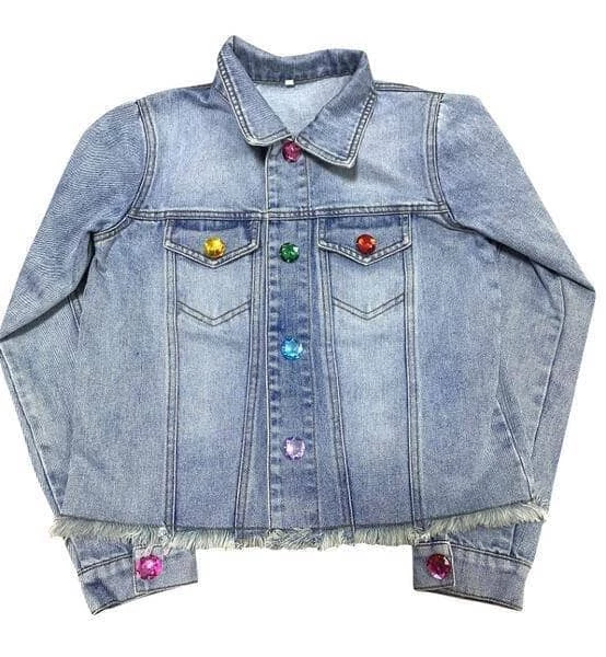 Light wash denim jacket with gem buttons, pocket, and cuff embellishments with a rainbow evil eye gem patch on the back!