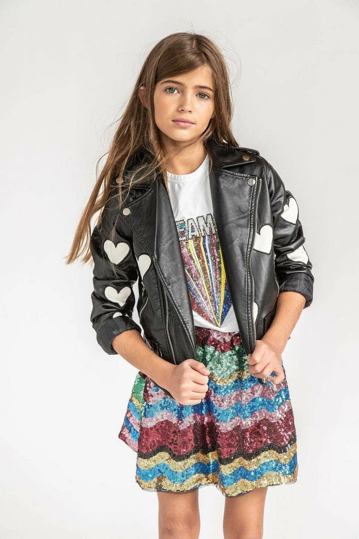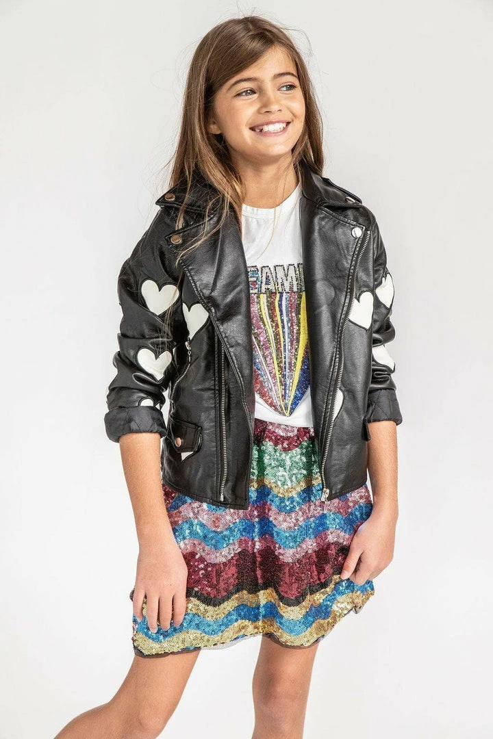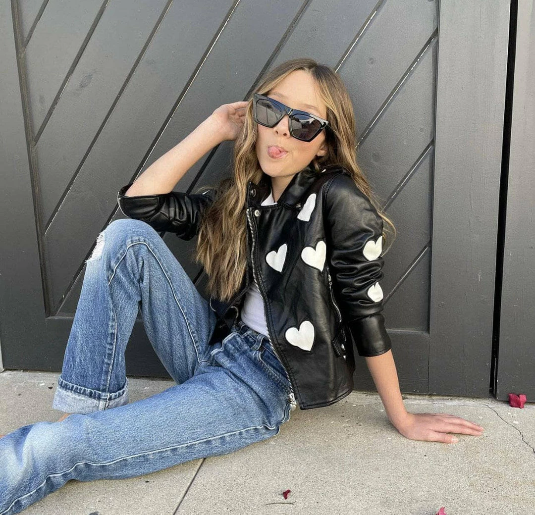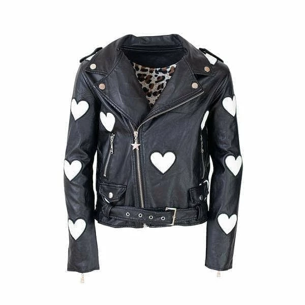Soft vegan leather moto lined with soft leopard lining Adorned with heart Patches makes this sweet and edgy
