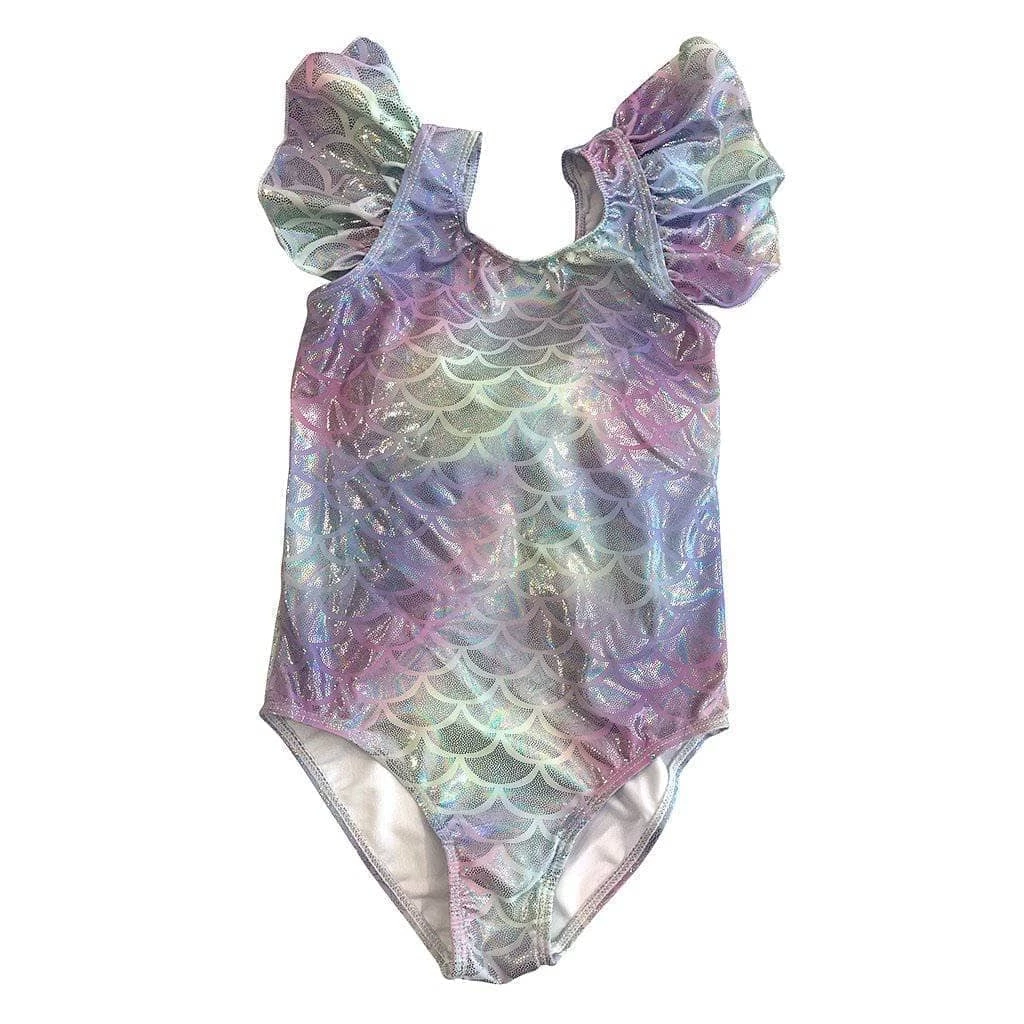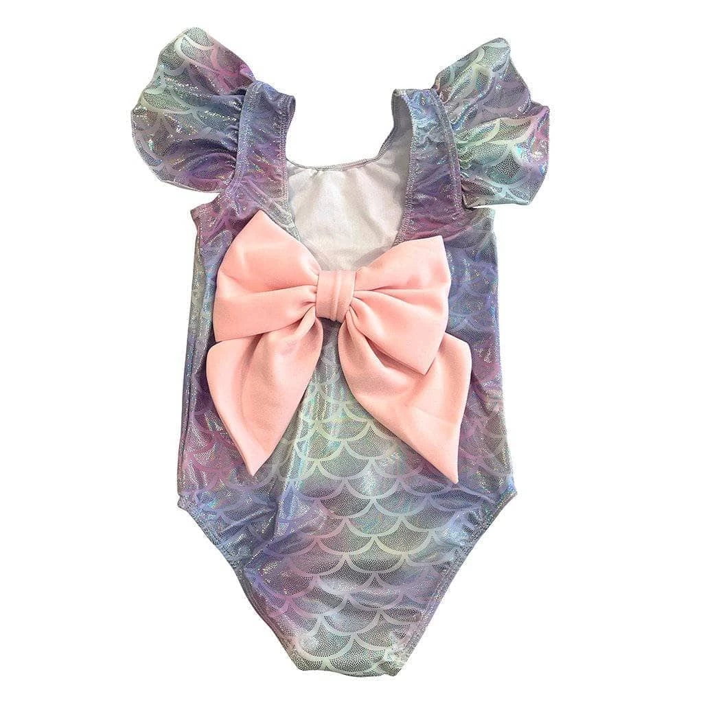 Metallic mermaid scale print adorned with the cutest pink bow on the back.