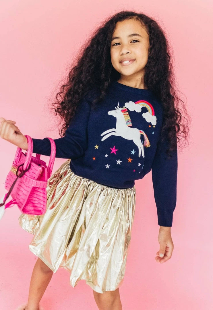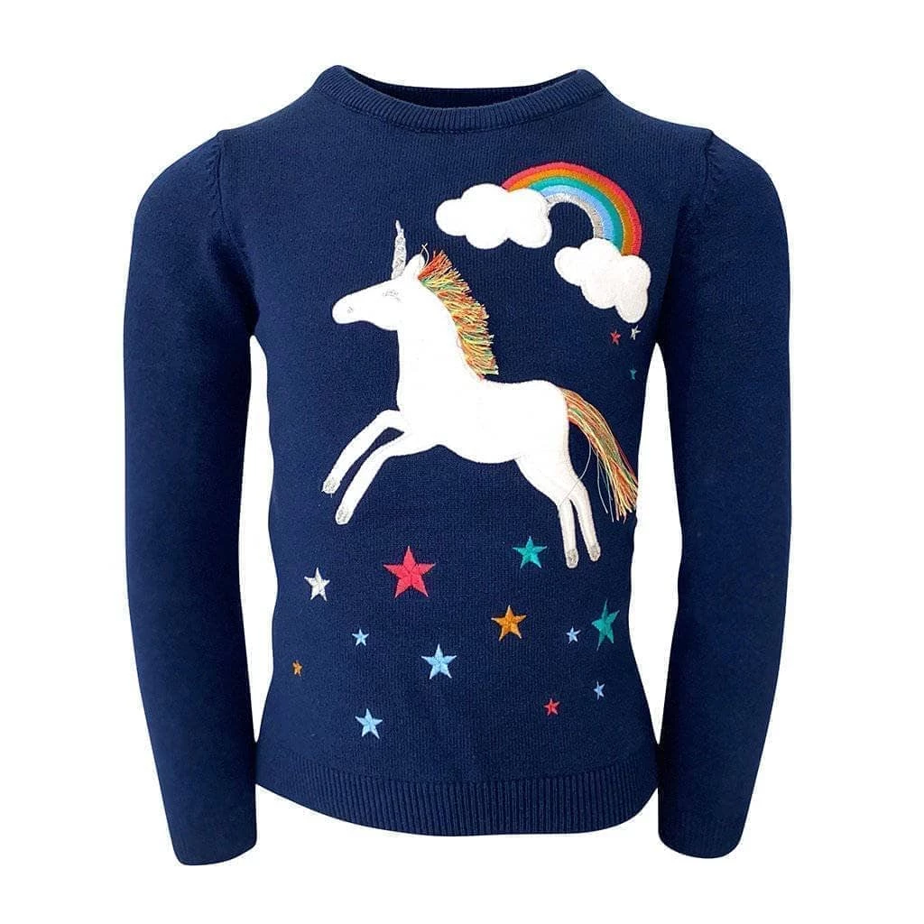 Super adorable fitted sweater with super soft and cozy cotton sweater with white unicorn with rainbow fringe mane and tail, stitched rainbow and cloud and stitched multicolored stars