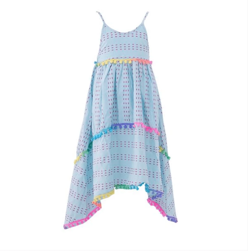 This high low dress is long in the back and shorter in the front, it’s the perfect day to night dress. The rainbow pompoms give it the perfect pop of color!