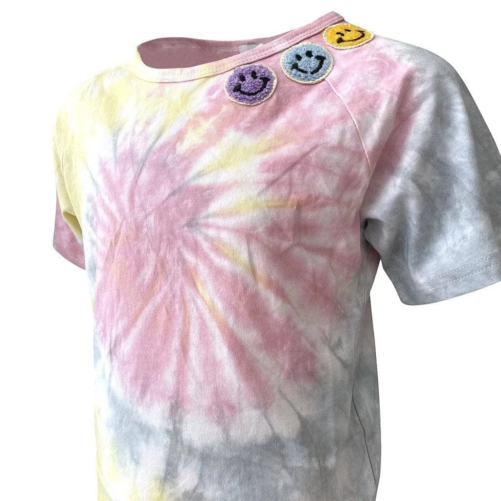 the cutest pastel tie dye set with baby smiley face patches on the collar!