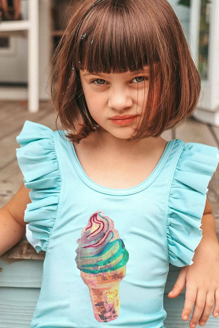 Cute ruffle trim on the shoulders and legs make this sequin ice cream suit the sweet for winter vacations and summer fun!Â
