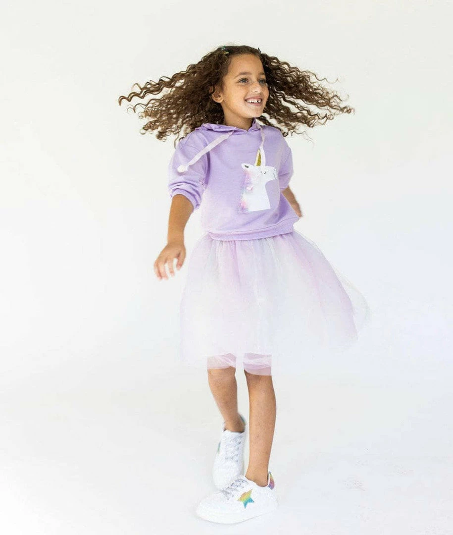 Lavender light weight hoodie with cute happy unicorn on the front paired with matching pastel tutu!Â