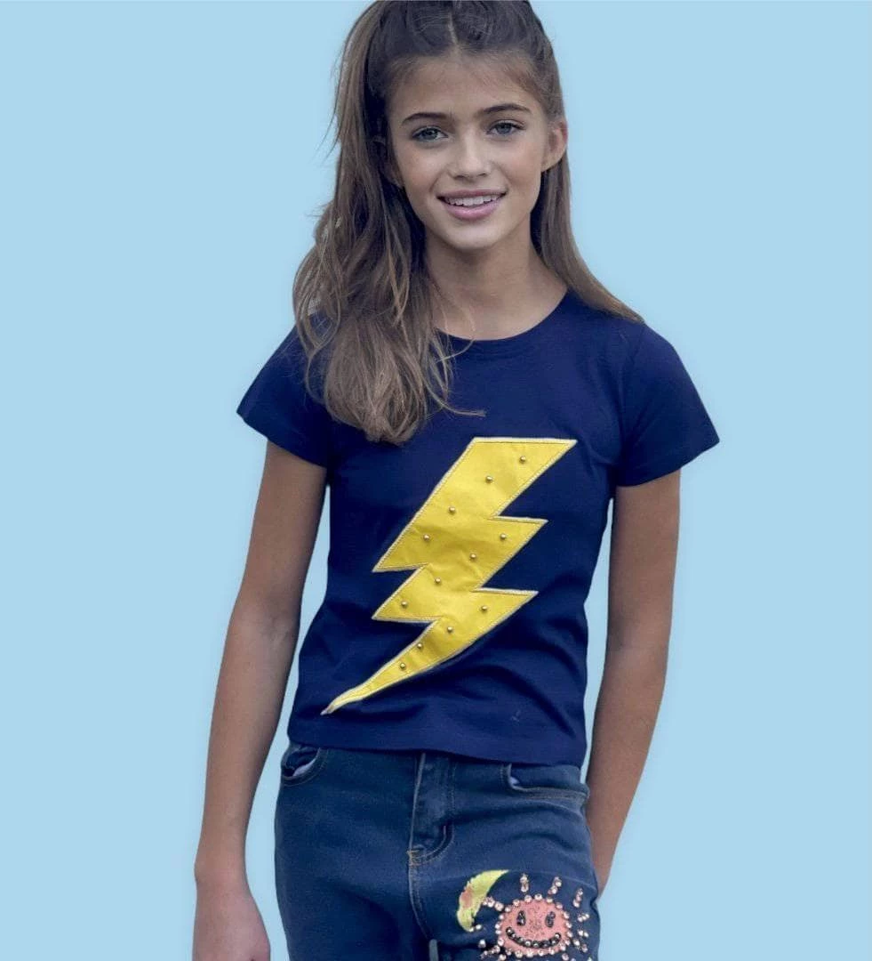 Navy tee with yellow faux leather lightning bolt and gold studs!