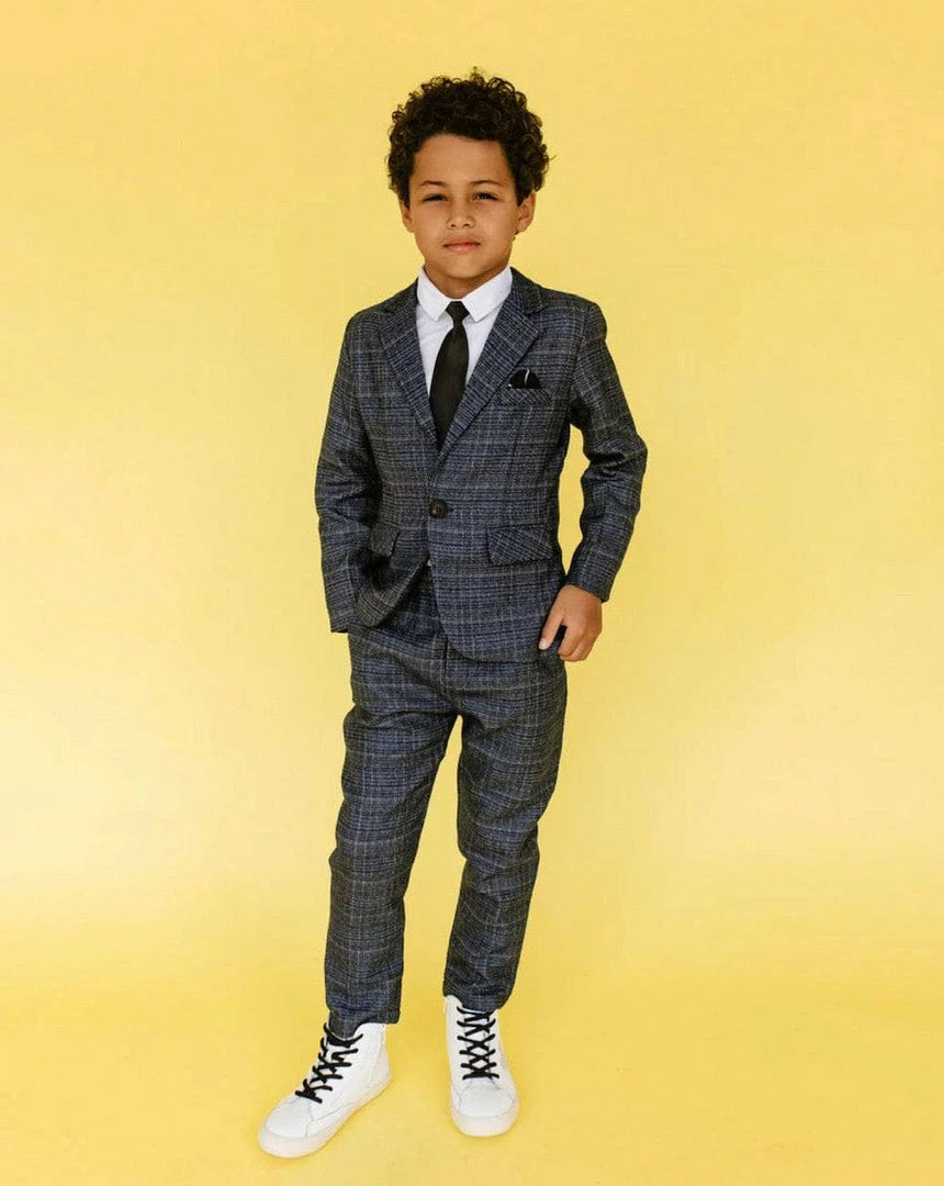 Outfit him for special events in this stylish navy plaid suit with stretch—just in case there’s dancing involved.
