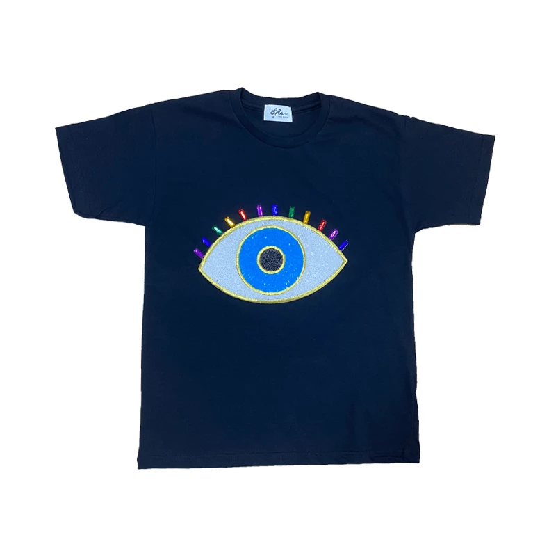 Short sleeved cotton tee embellished with heavily beaded rainbow evil eye, coming in white and black tee colors