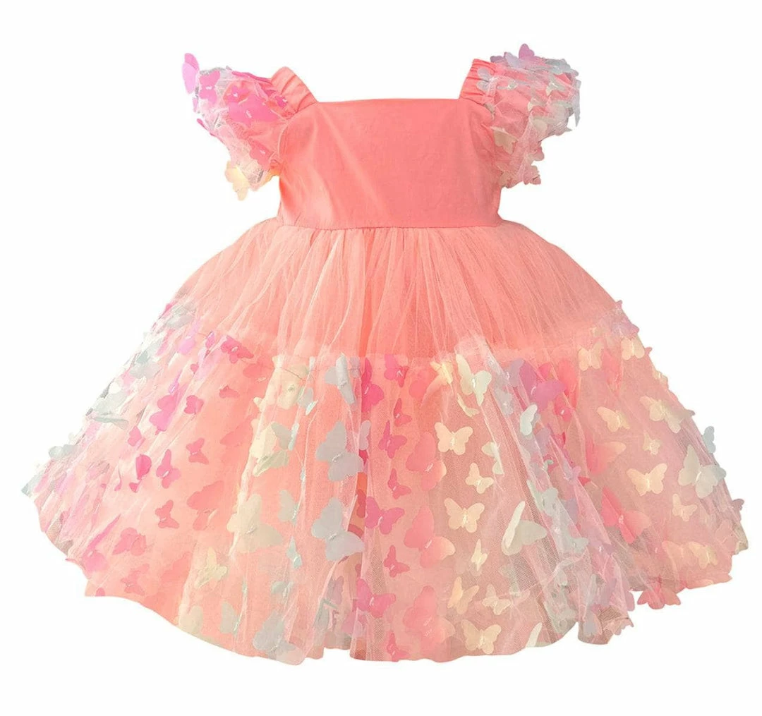 Baby doll style baby pink dress with puff shoulder sleeves covered in ombre 3D flower petals!