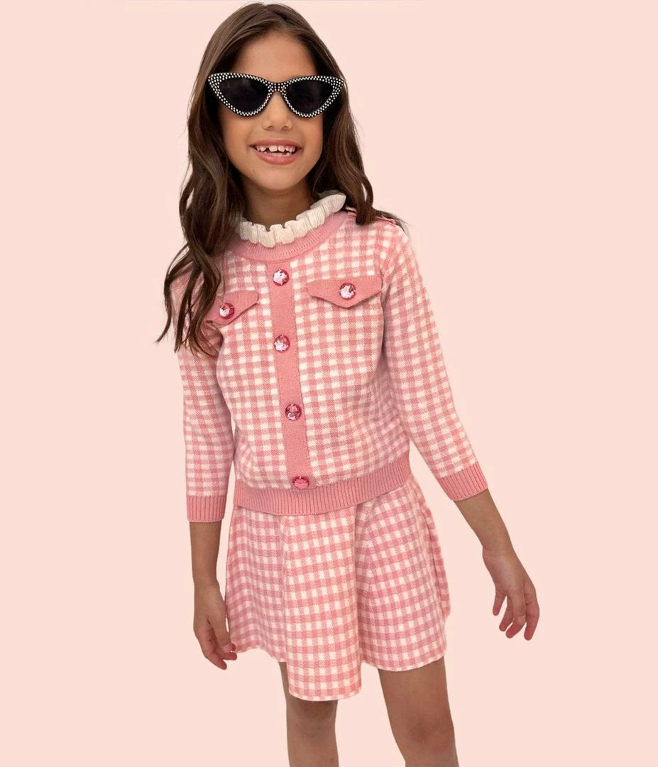 Knit gingham set with the cutest top and skirt pink and pink gem buttons