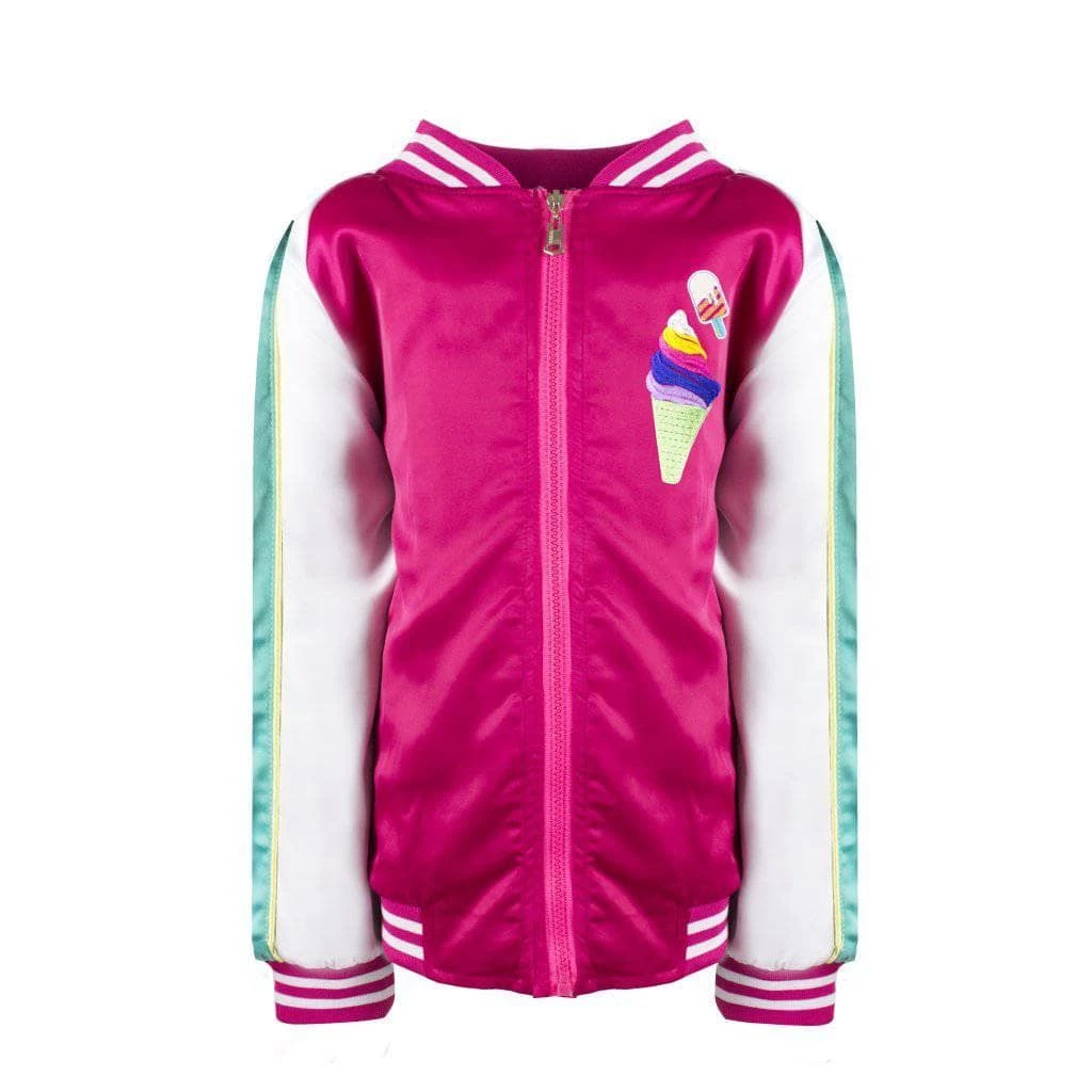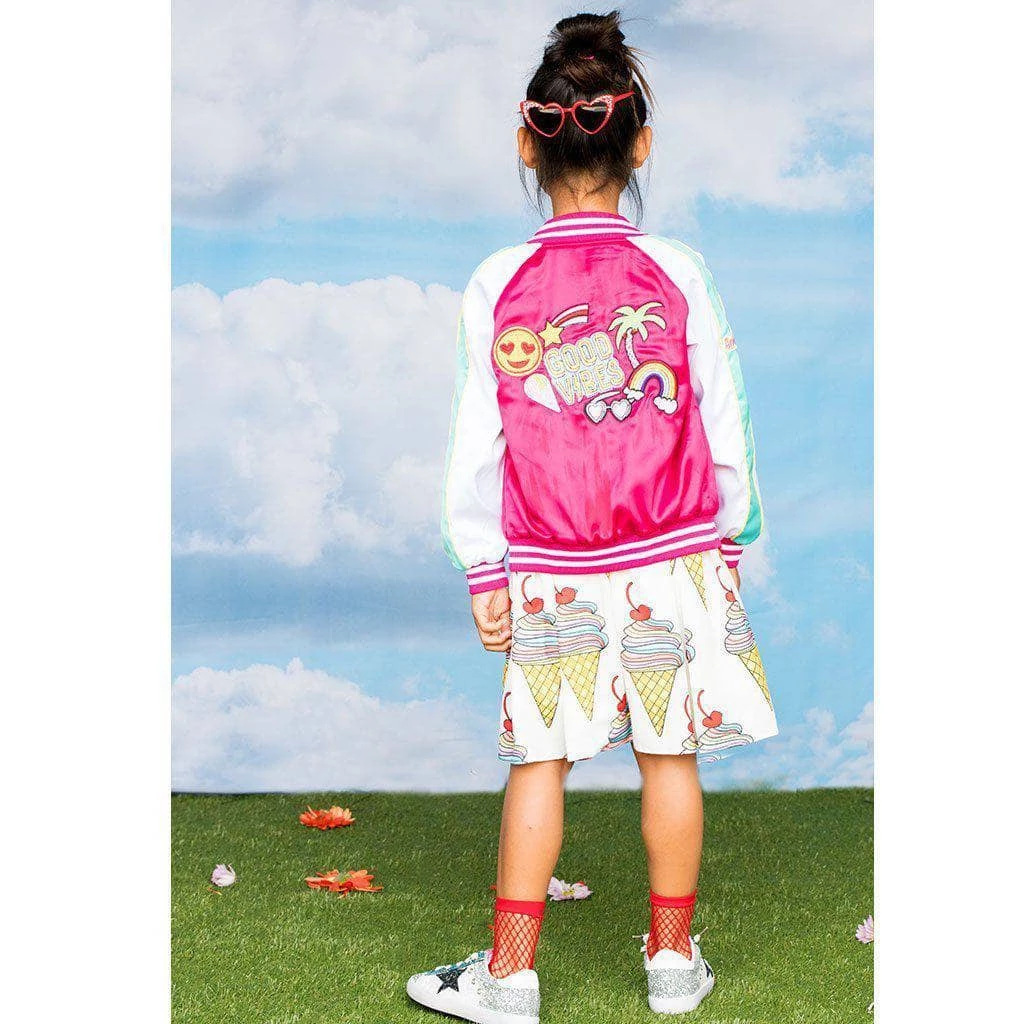 Rock the summer with our Girls Good Vibes Embroidered Satin Bomber. This hot pink satin bomber features embroidered emojis, sunglasses, ice cream and rainbows with a varsity striped ribbed trim.Â