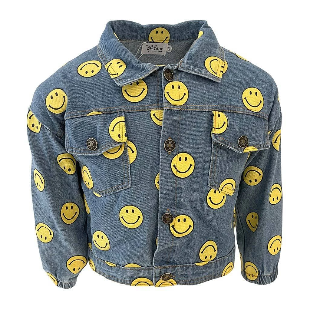 Bright and uplifting denim jacket with smiley faces throughout the whole jacket! Perfect for everyday wear.