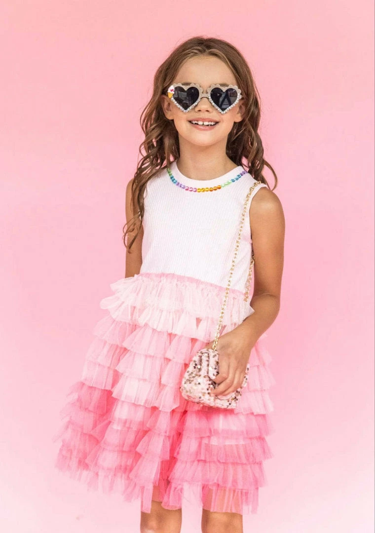 Rainbow gem trim on this beautiful tank dress with an ombré tulle skirt