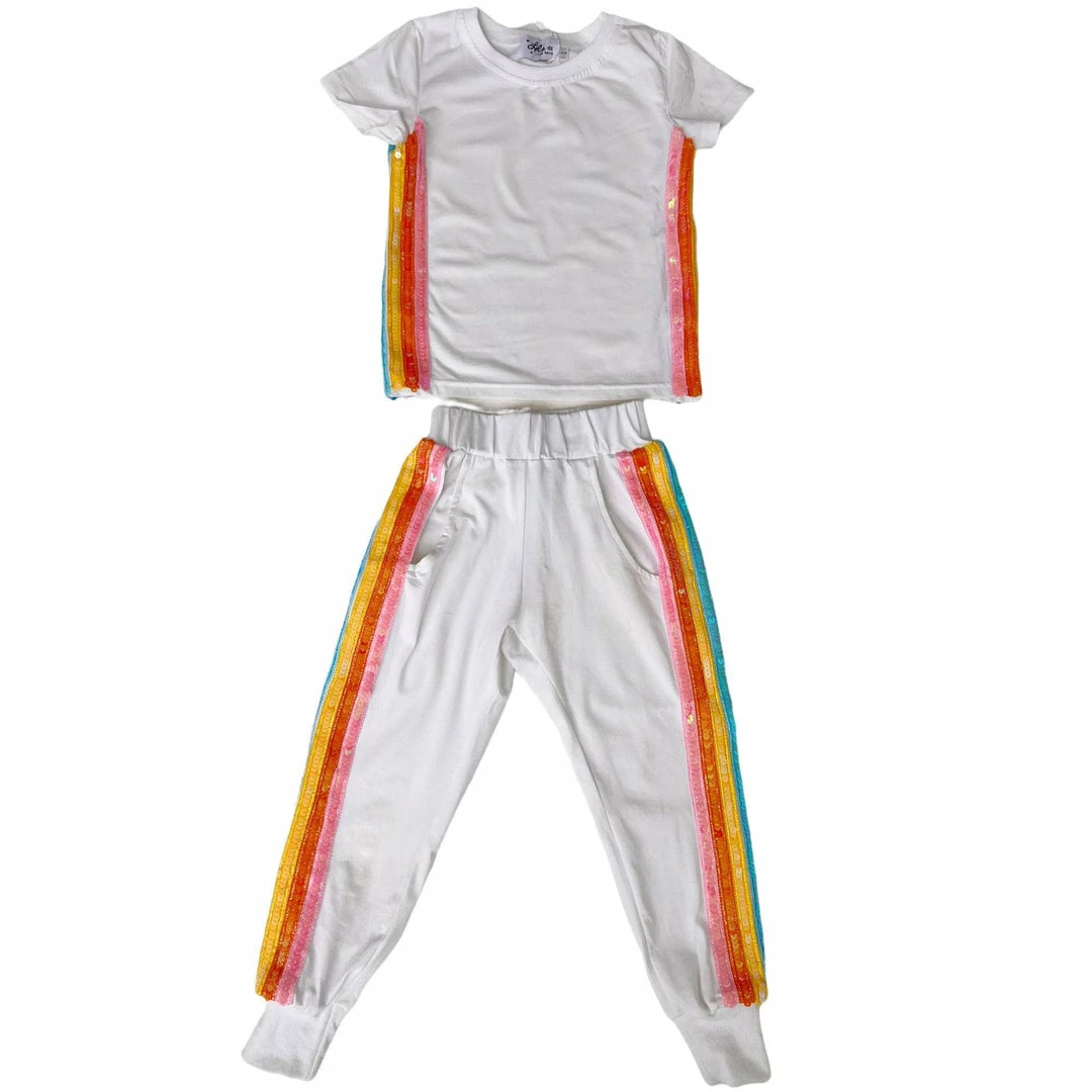 Be the first to review “Lola + The Boys New Arrivals White Rainbow Sequin Jogger Set” Cancel reply