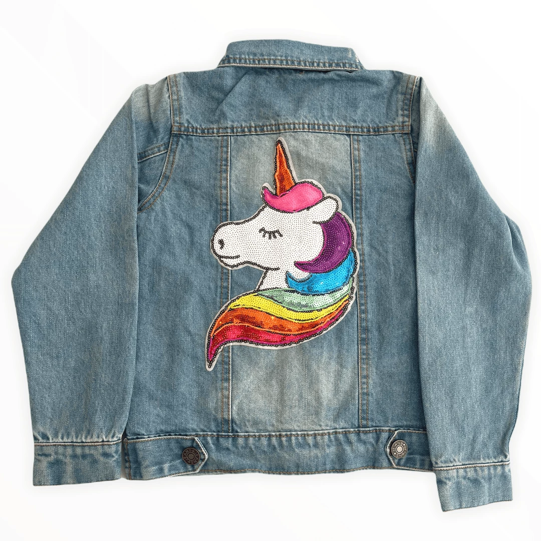 Light wash denim jacket with rainbow beaded trim along the sequin rainbow unicorn patch!