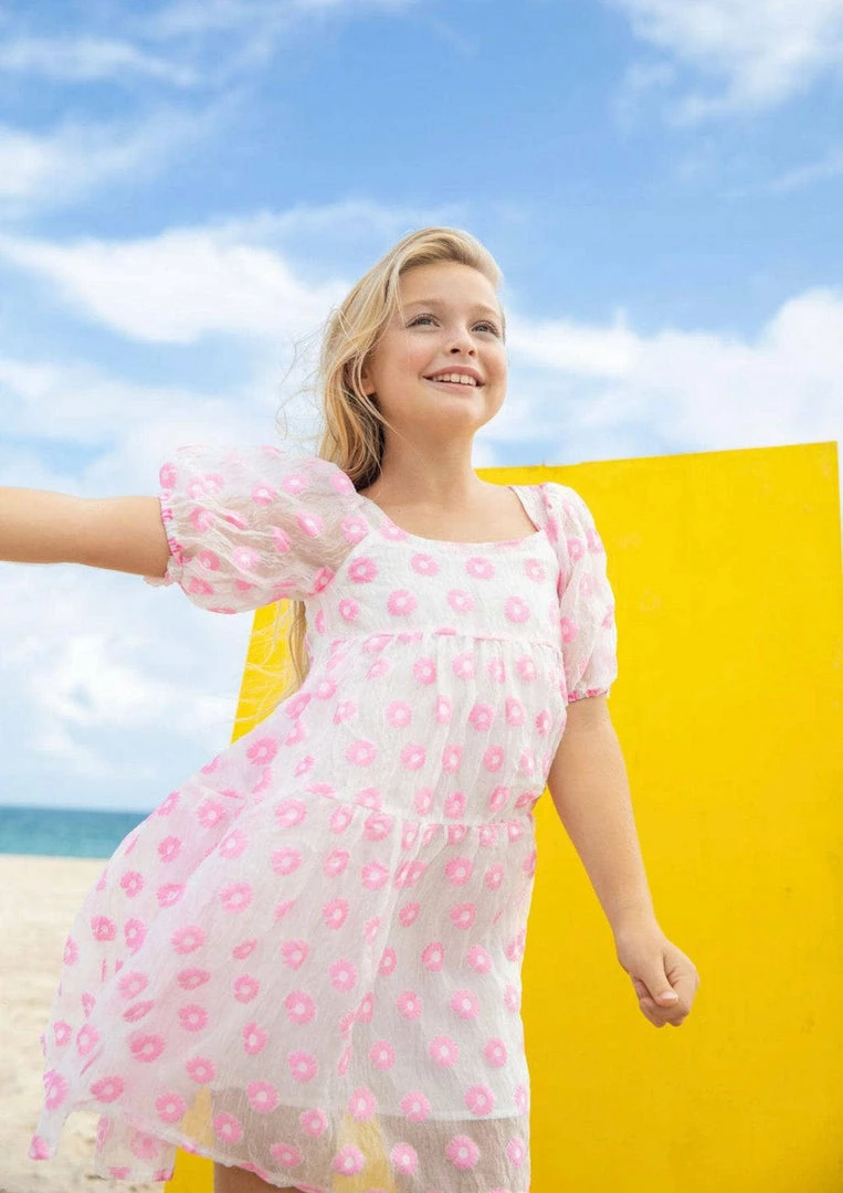 Pink Daisy Poof Dress is made of cotton fabric. It is lightweight, breathable, and comfortable for summer wear. The dress comes with a nice floral pattern on the top and bottom parts of the dress. The sleeves have a cute flowery design at the end which makes this dress very feminine and beautiful to wear! The dress can be worn for any occasion like parties, weddings, or just casual outings with friends.