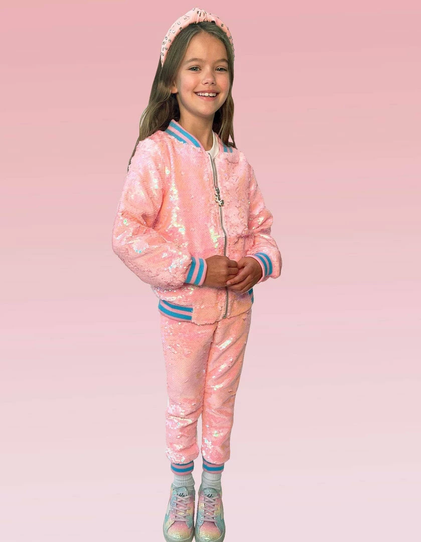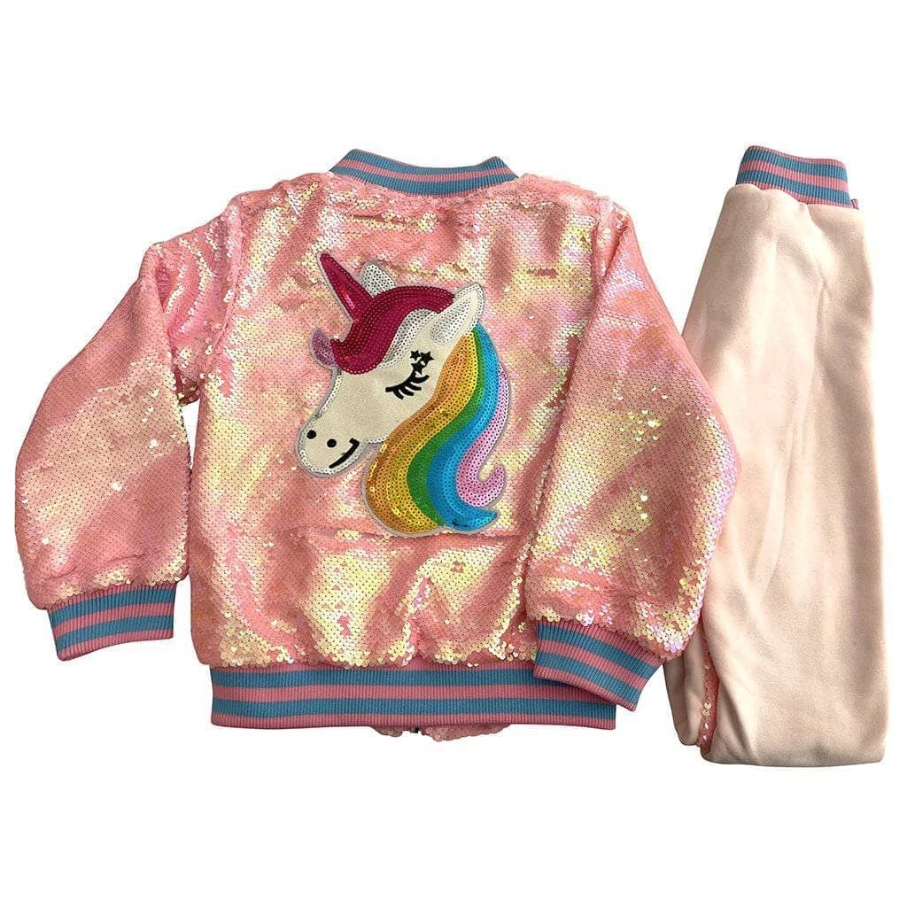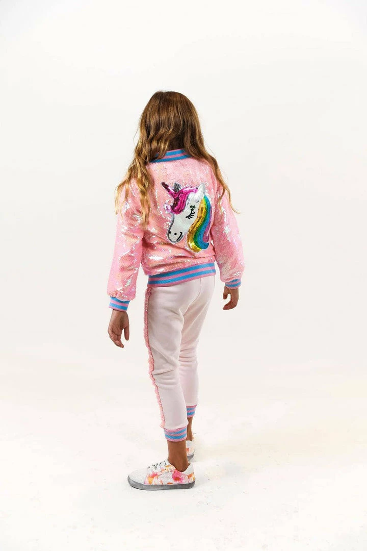 Fully sequined pink bomber and jogger set with colorful unicorn patch on the back! The perfect outfit to make a statement!