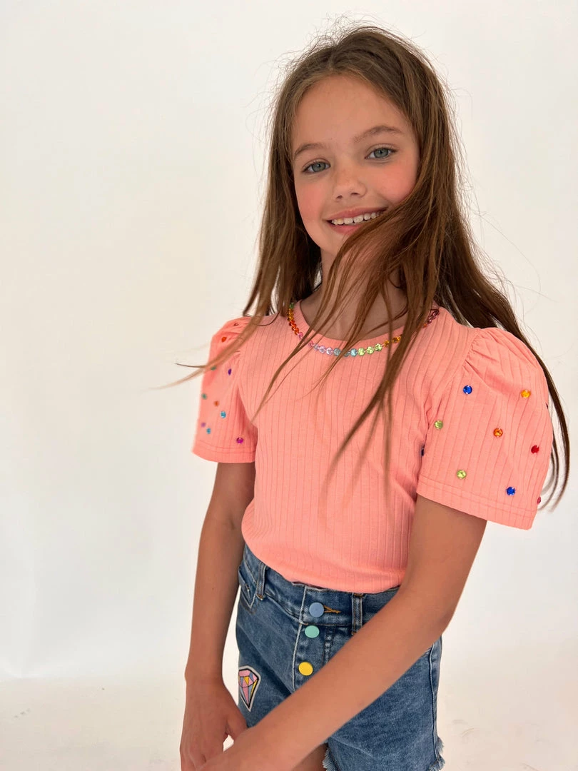 Cutest peach short sleeve top with puff shoulders and gems.
