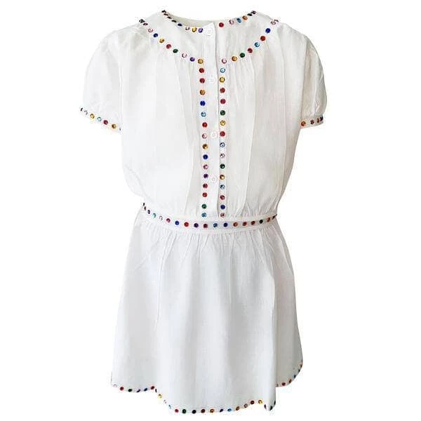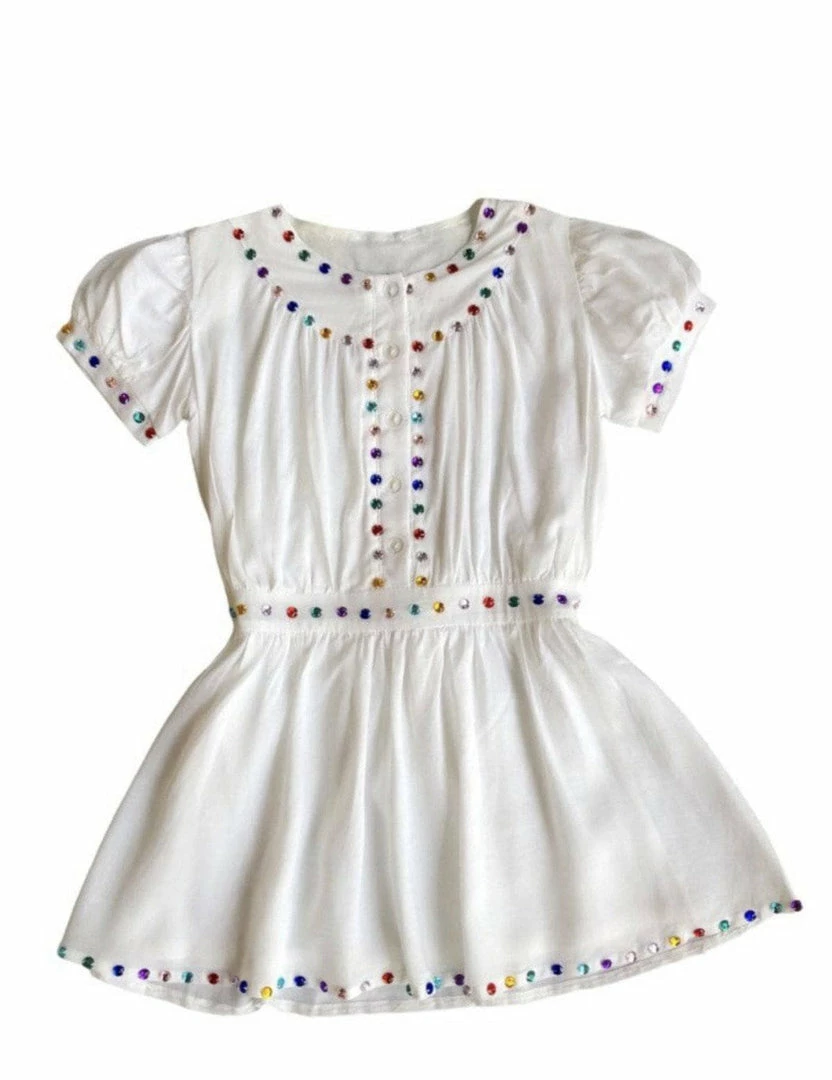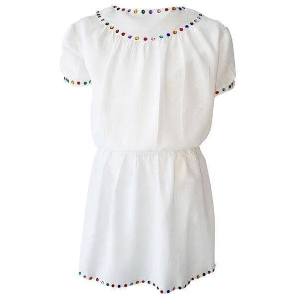 Light weight white linen dress with rainbow jewels along hemlines. Waistline accent and front button fasten.
