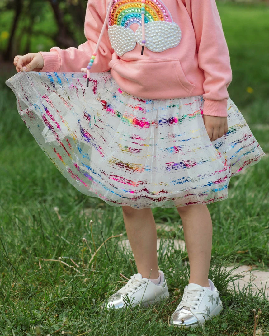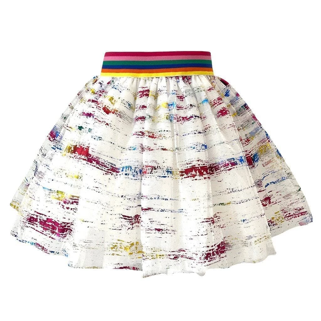 White tutu with neon rainbow waistband and foiled rainbow flakes!