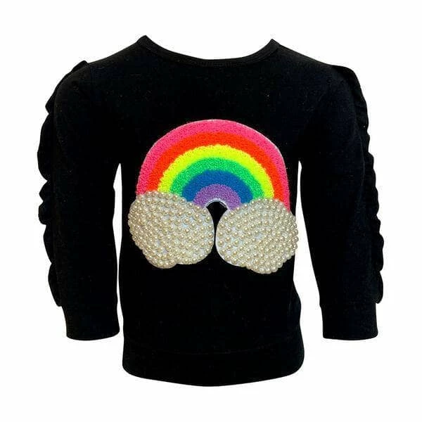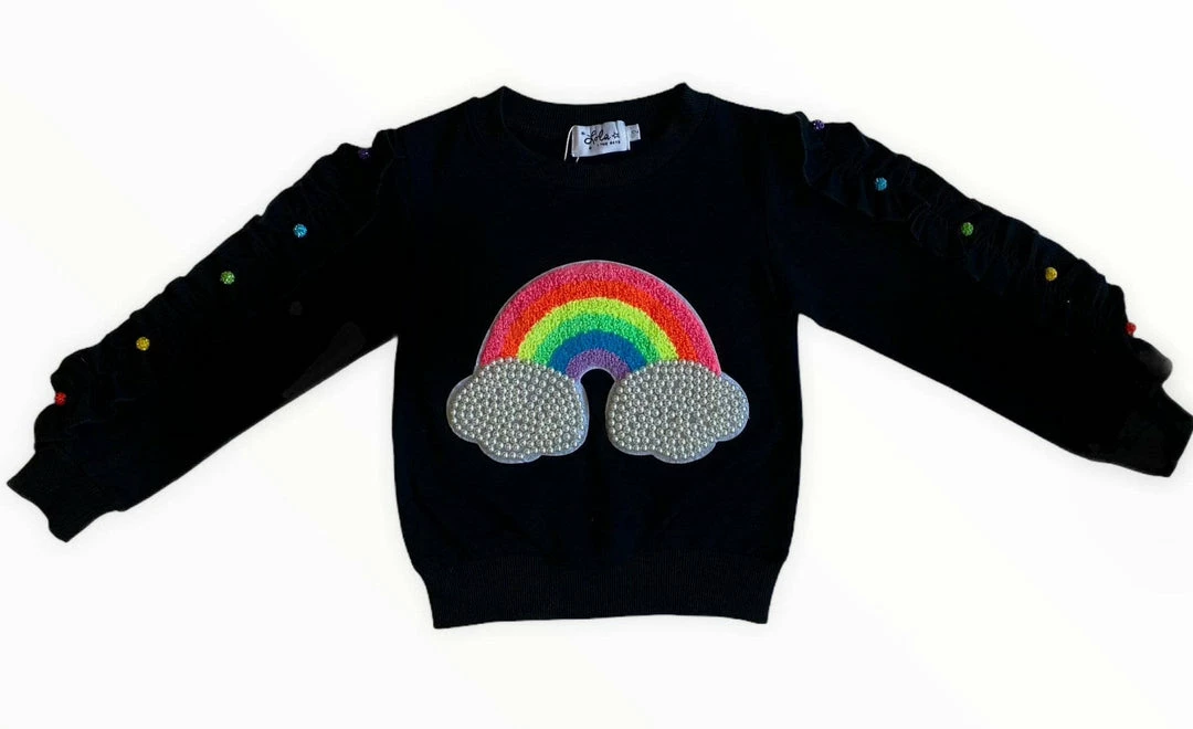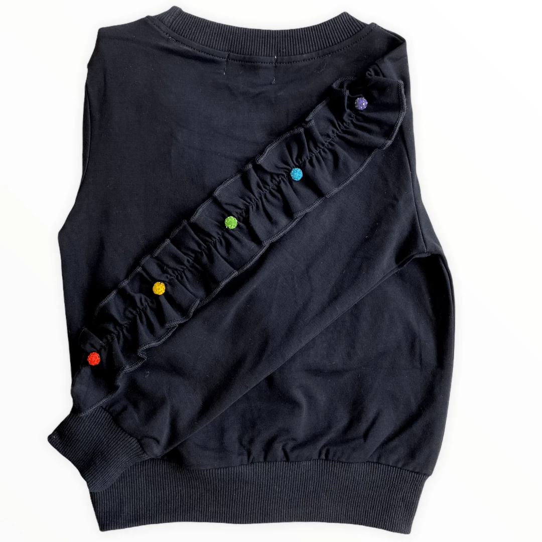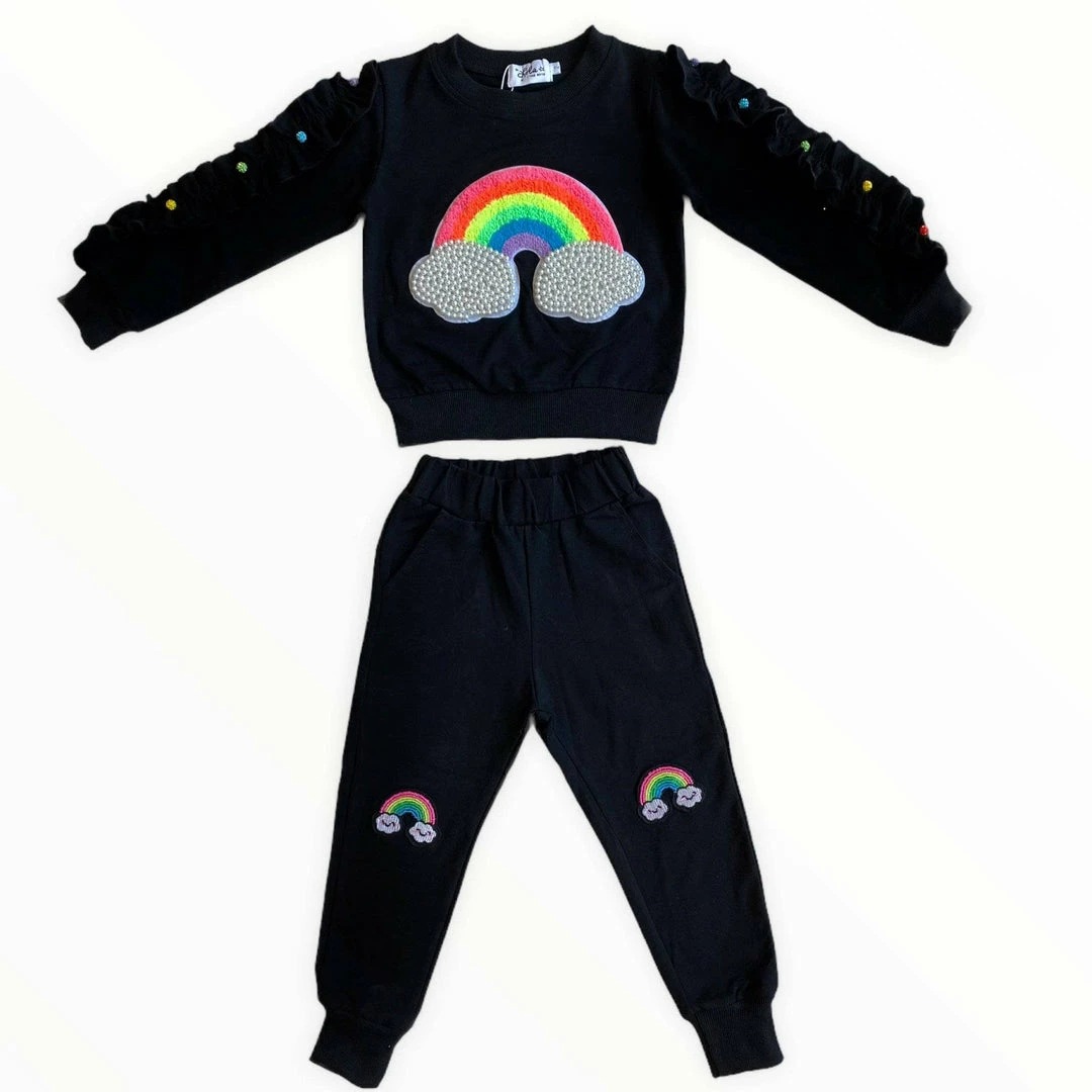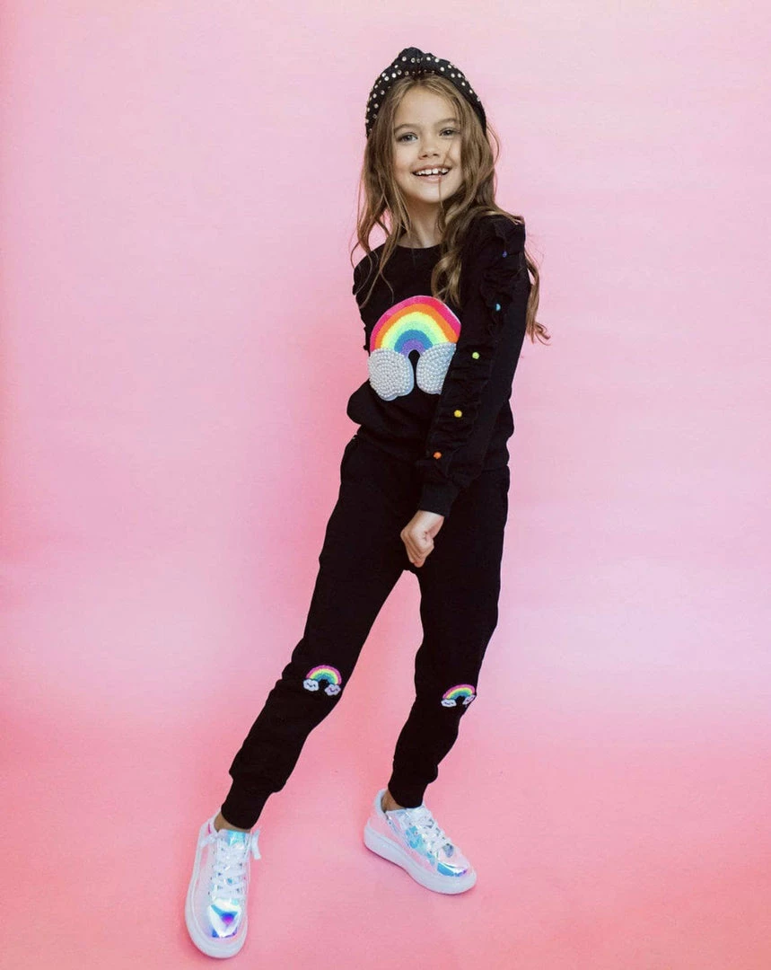 Black ruffle sleeve jogger and crewneck set with beaded rainbow patches on the crewneck and both knees of the pants!