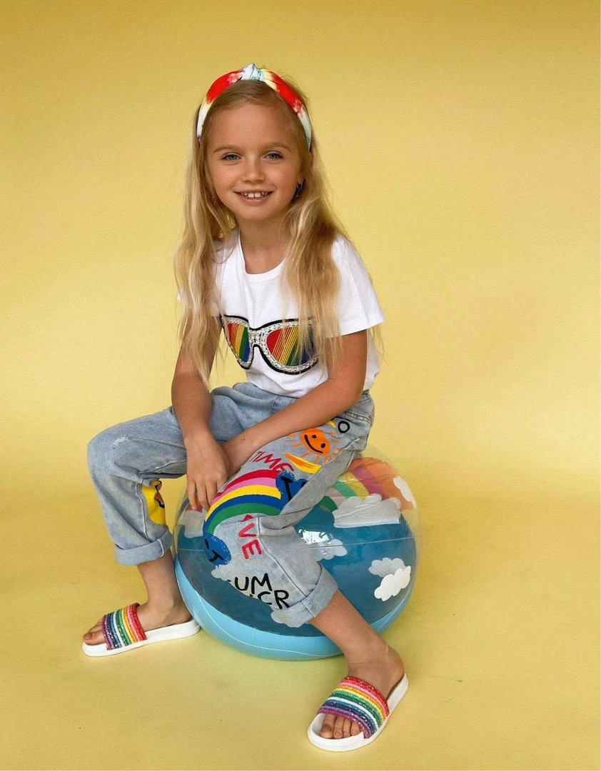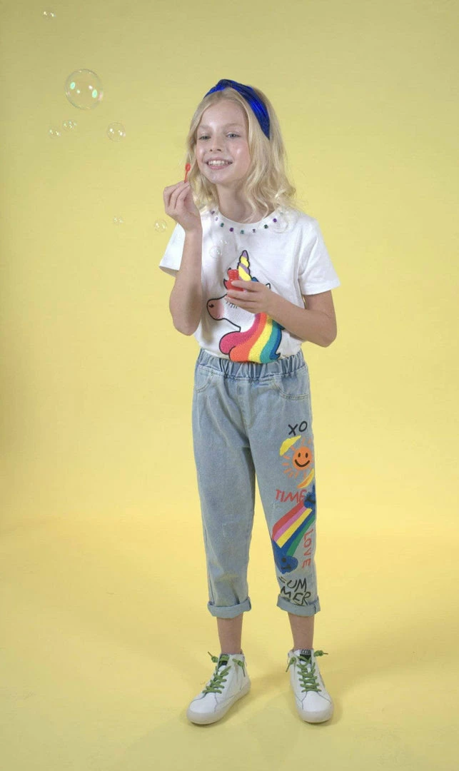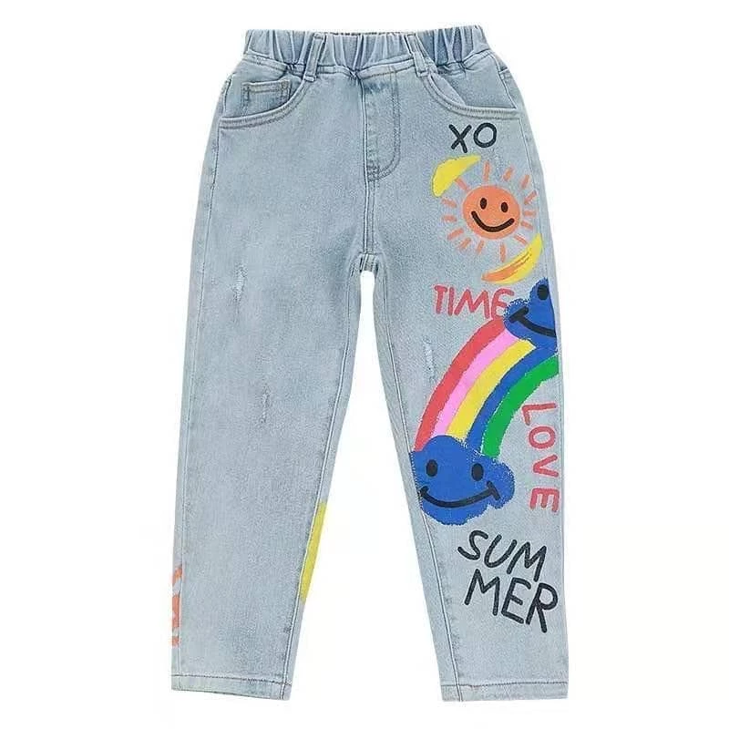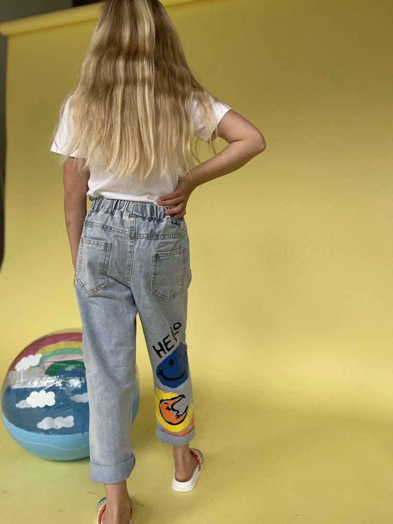 Light wash boyfriend style jeans with rainbow smiley summer painted design!