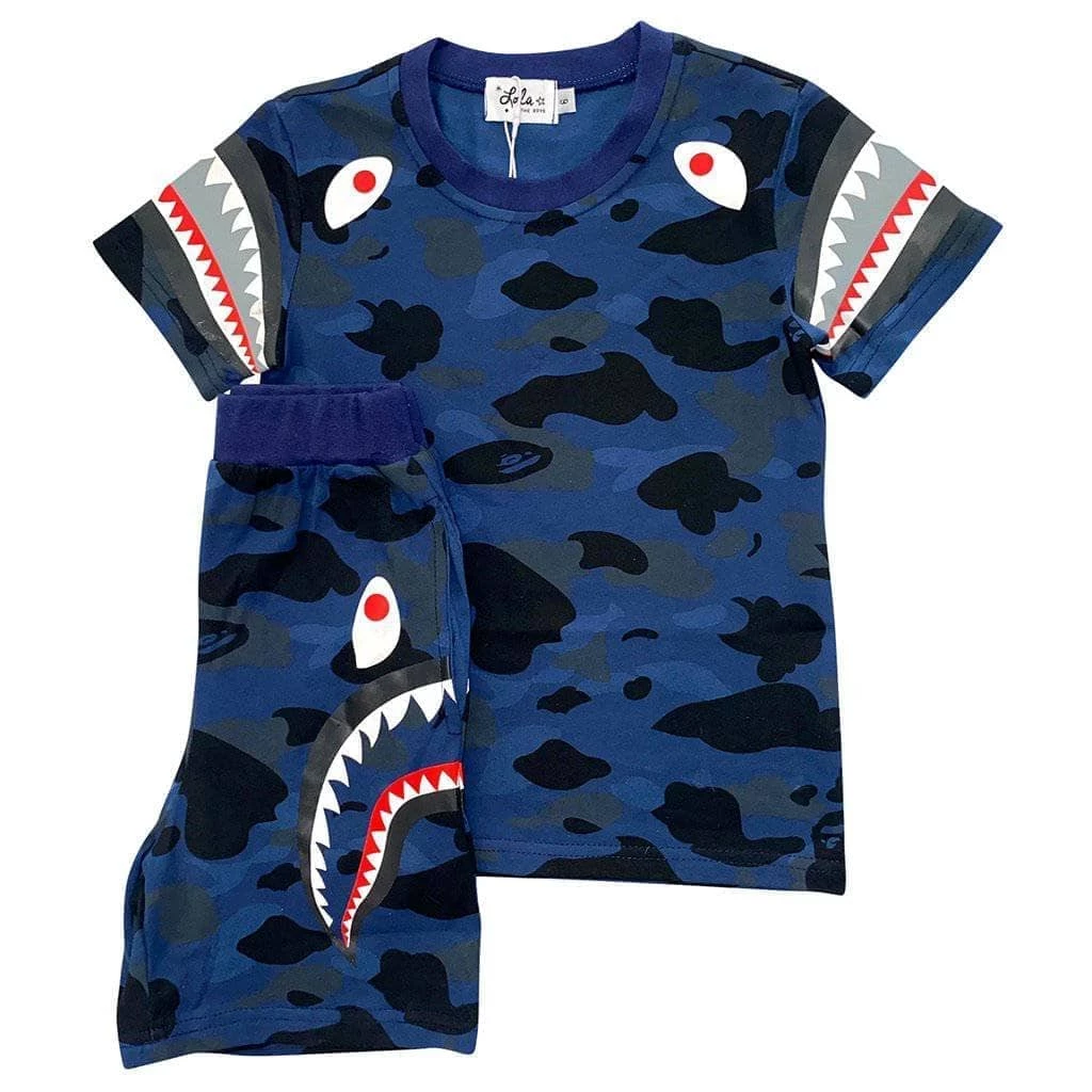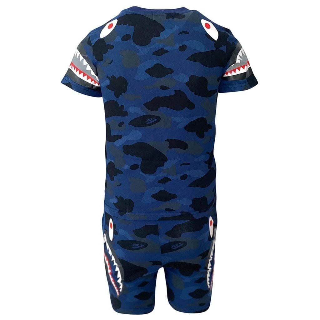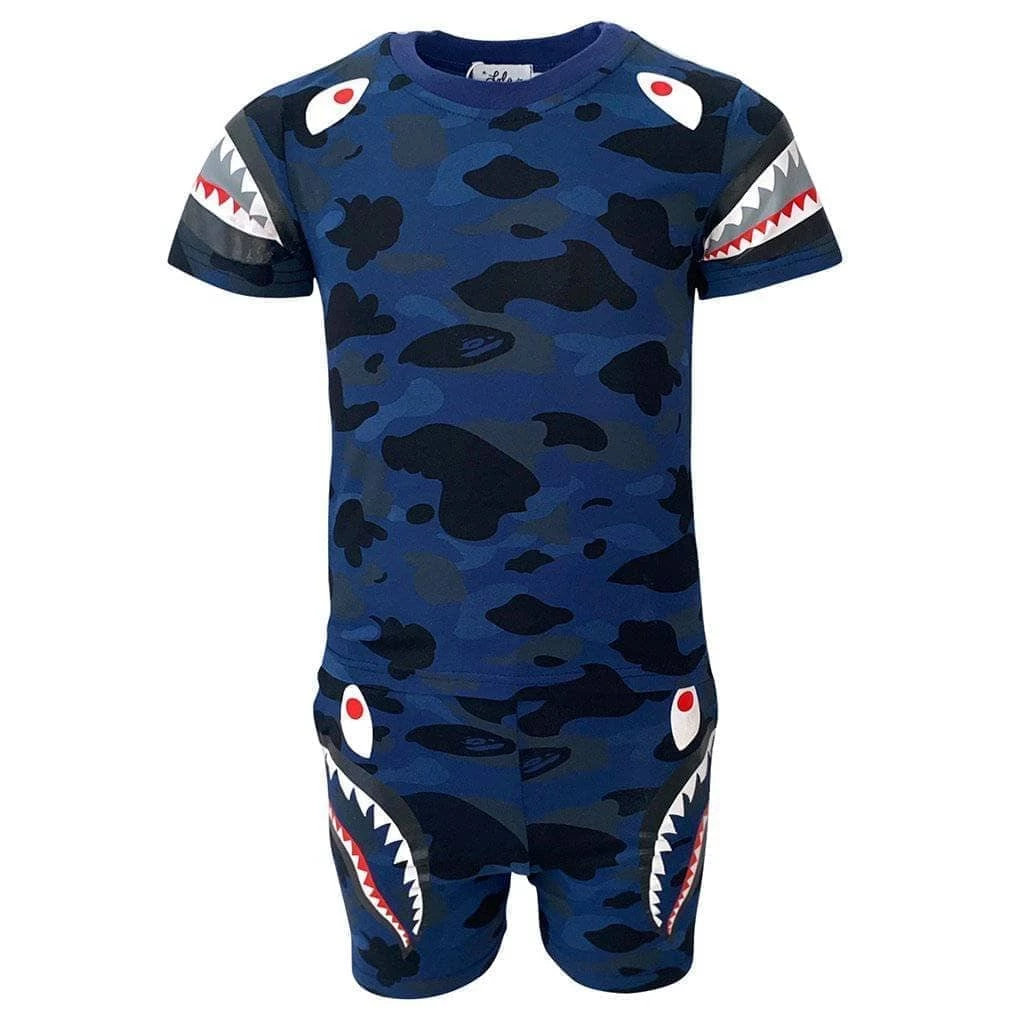 The coolest shark inspired set with blue camo and shark teeth on the sleeves and pant legs!