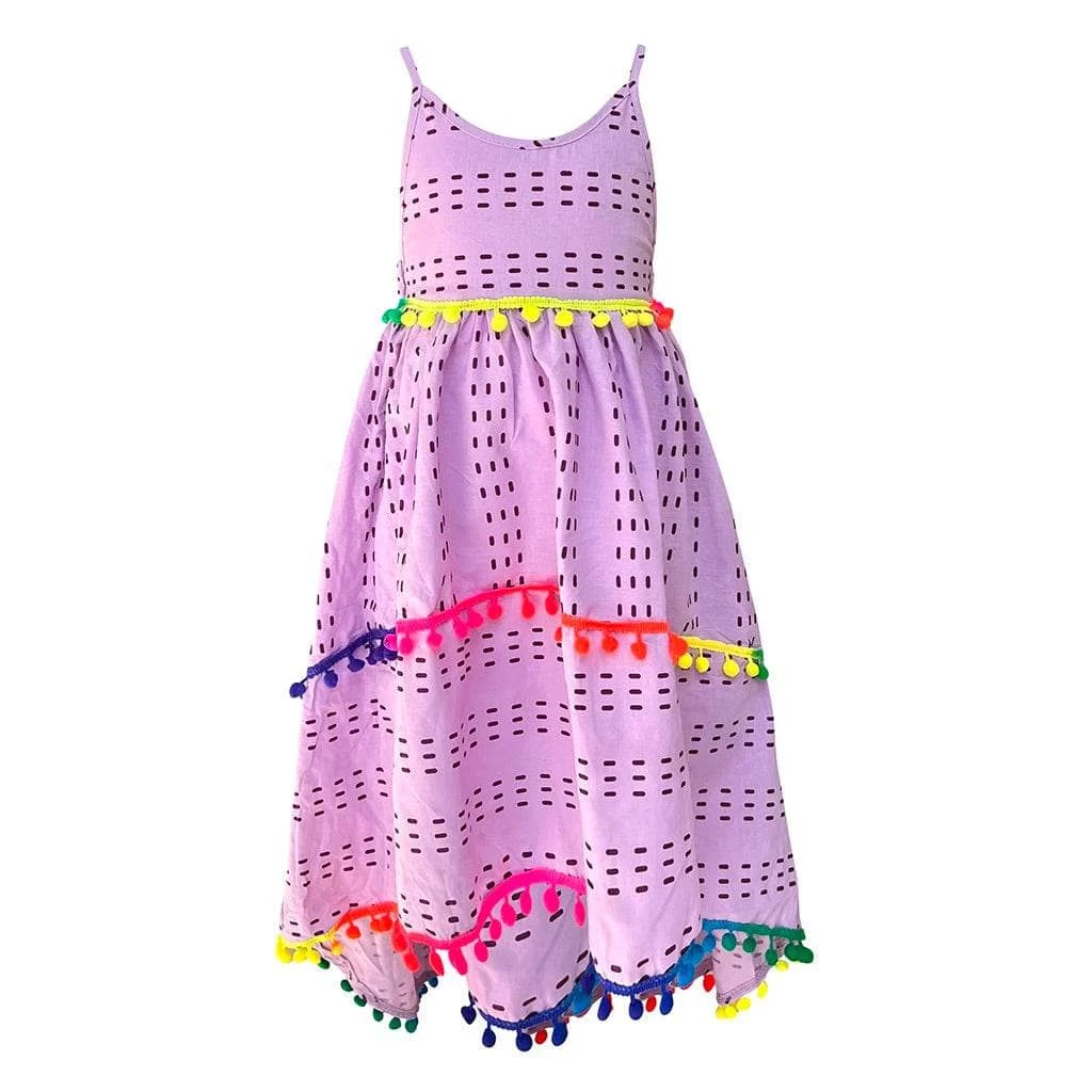 This high low dress is long in the back and shorter in the front, itās the perfect day to night dress. The Rainbow pompoms give it the perfect pop of color!