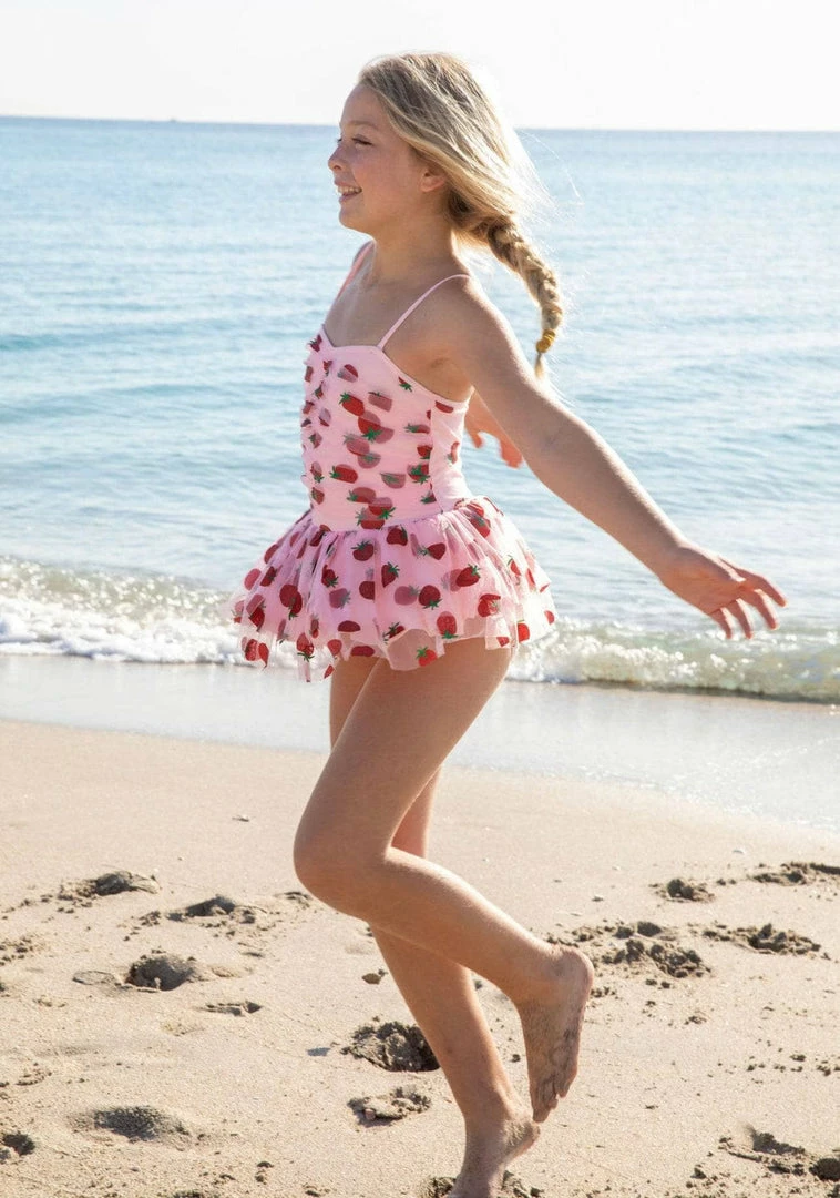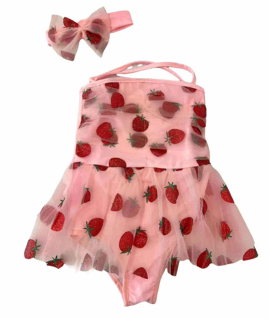 This cute swimsuit is perfect for your little girl to wear to the pool or beach. The pink strawberry tulle swimsuit comes with a matching headband. This is a great gift idea for your daughter, niece, granddaughter or any special girl in your life!