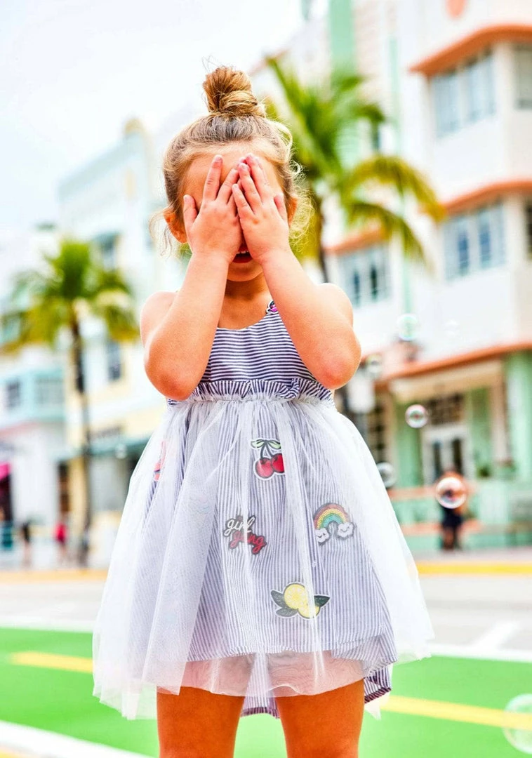 Black and white striped tshirt dress with tulle overlay covered in colorful rainbow patches and candy bead straps!