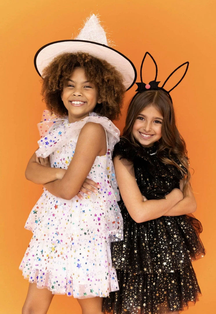 White tiered fluffy tulle dress with rainbow stars and gold trim!